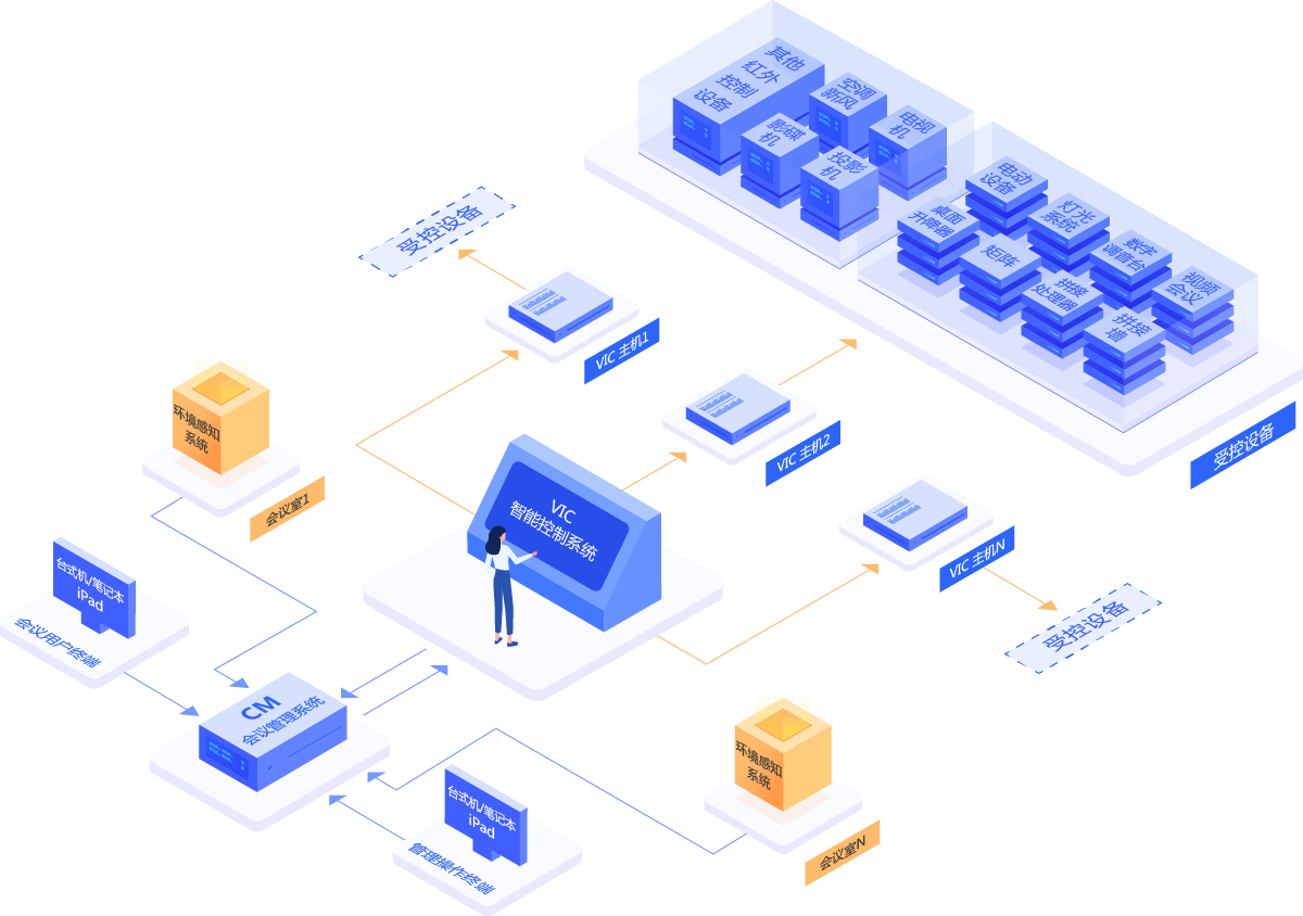 VIC可以控制会议室内的诸多电子设备,包括会议室环境设备以及会议室音视频设备。所有操作可以在总控室完成,